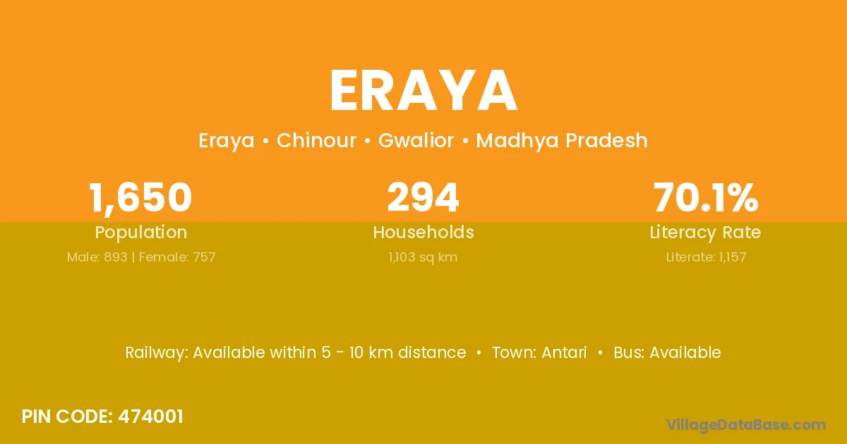Eraya village has a total population of 1,650 people, of which 893 are males and 757 are females.