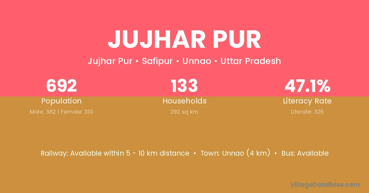 The literacy rate of Jujhar Pur village is 68.01%. Male literacy stands at 82.39% and female literacy at 50.68%.
