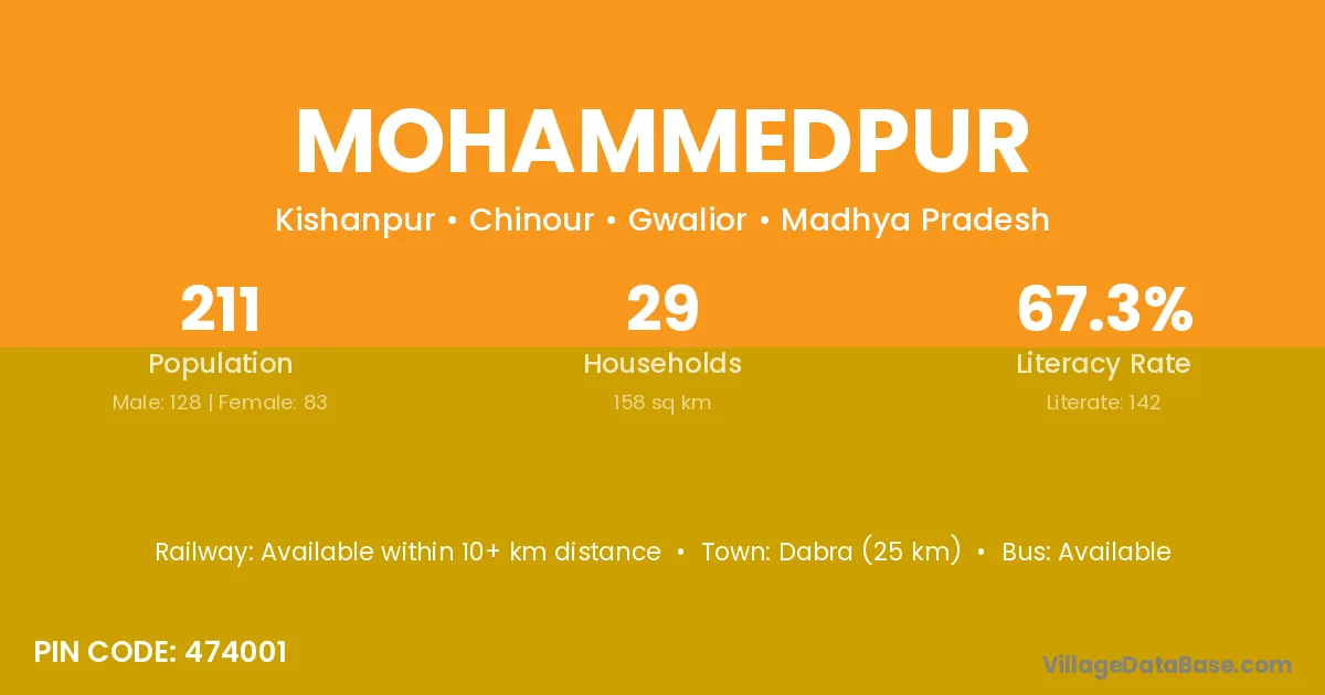 Mohammedpur village has a total population of 211 people, of which 128 are males and 83 are females.