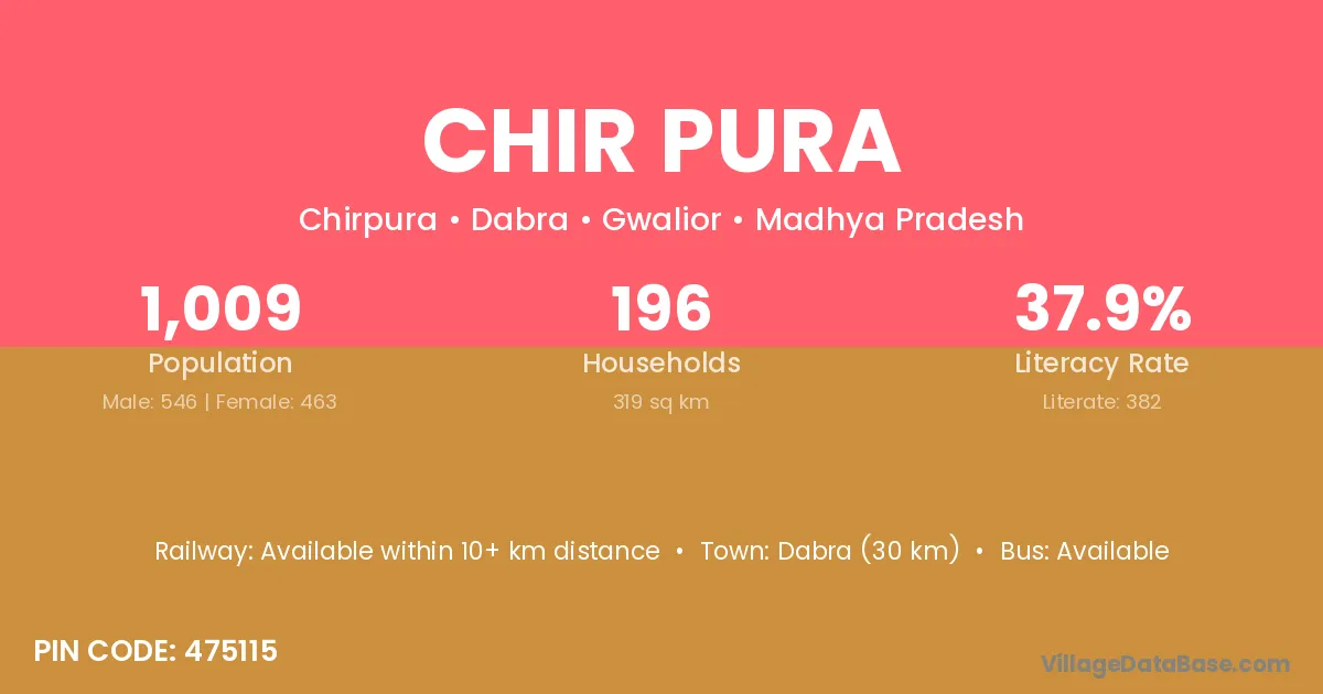Dabra (30 km) is the nearest town to Chir Pura village for major economic activities and is located approximately 30 km away.