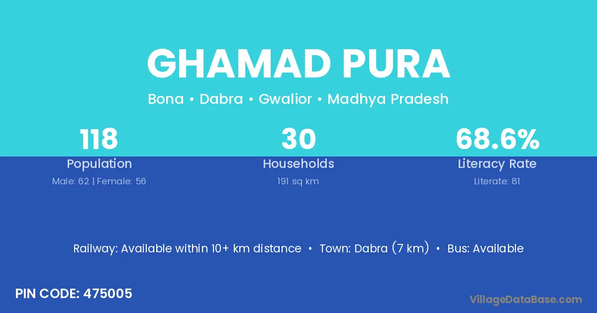Dabra (7 km) is the nearest town to Ghamad Pura village for major economic activities and is located approximately 7 km away.