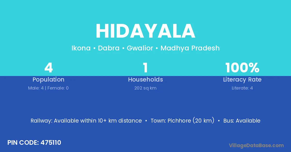 Pichhore (20 km) is the nearest town to Hidayala village for major economic activities and is located approximately 20 km away.