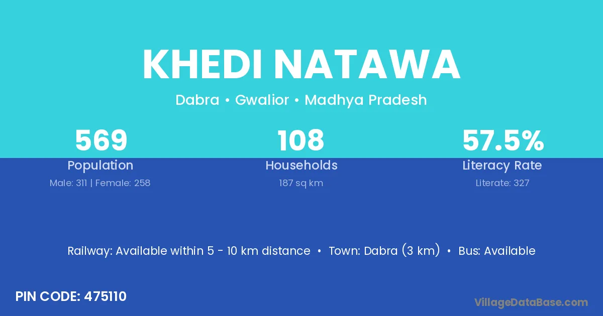 Dabra (3 km) is the nearest town to Khedi Natawa village for major economic activities and is located approximately 3 km away.