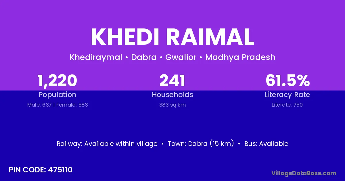 Dabra (15 km) is the nearest town to Khedi Raimal village for major economic activities and is located approximately 15 km away.