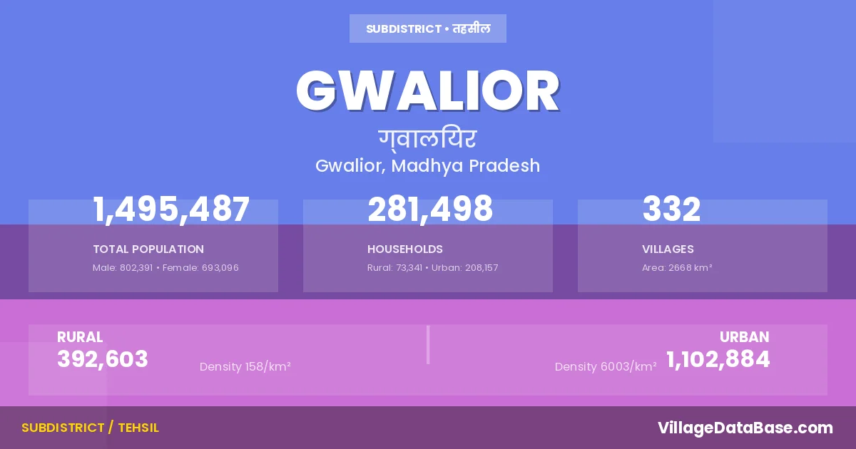 According to the 2011 census The total area of Gwalior Tehsil is 2668 km², with a population of 1495487 people. The population density is 561 inhabitants per square kilometre, and there are approximately 281498 houses in the sub district.