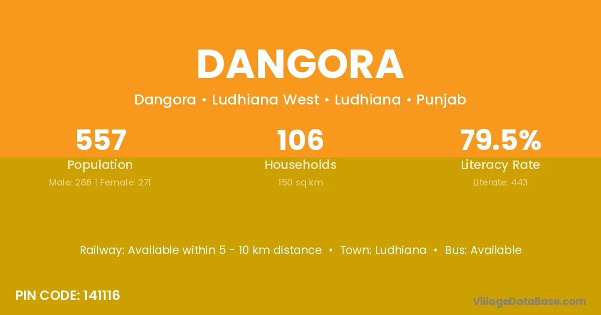The literacy rate of Dangora village is 61.28%. Male literacy stands at 73.65% and female literacy at 45.76%.