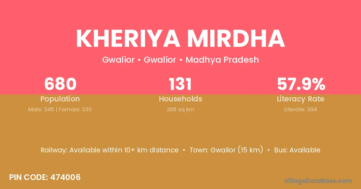 Gwalior (15 km) is the nearest town to Kheriya Mirdha village for major economic activities and is located approximately 15 km away.