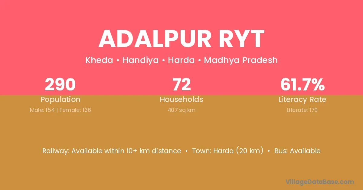 Harda (20 km) is the nearest town to Adalpur Ryt village for major economic activities and is located approximately 20 km away.