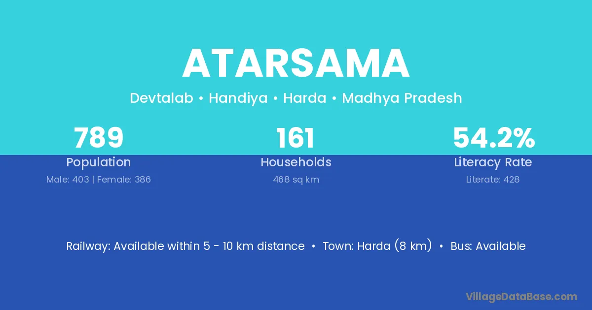 Harda (8 km) is the nearest town to Atarsama village for major economic activities and is located approximately 8 km away.