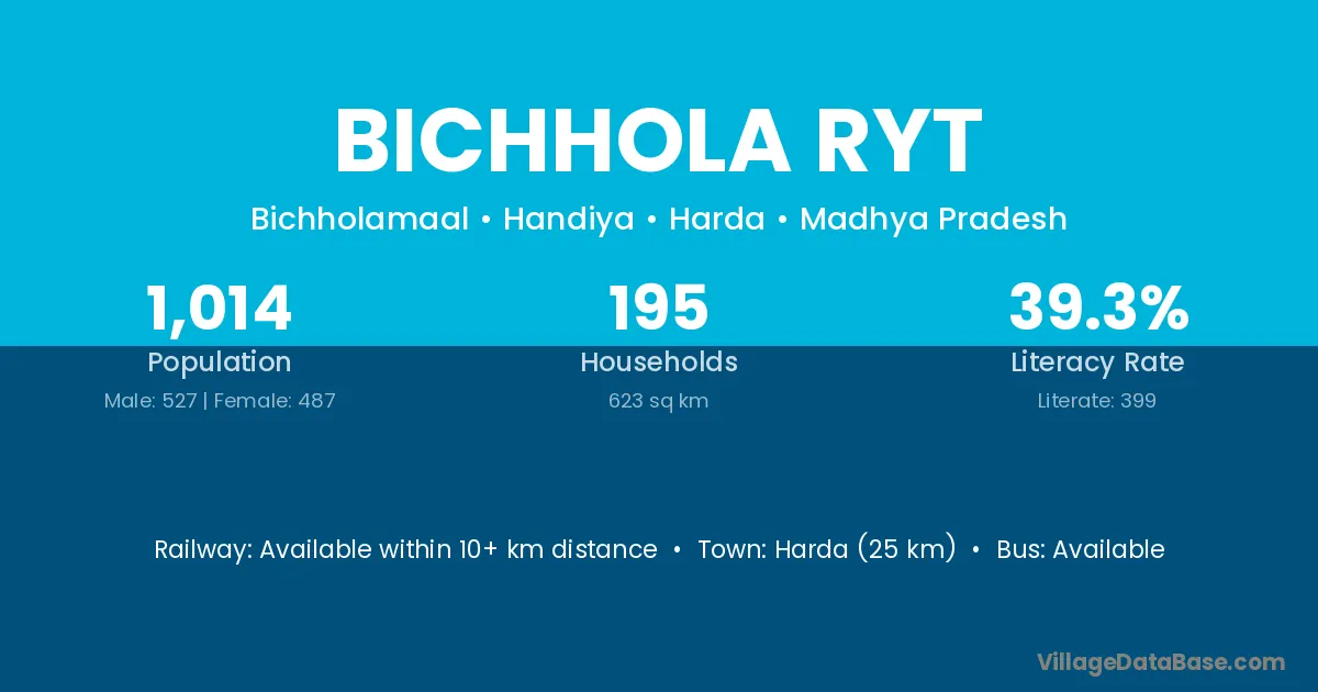 Harda (25 km) is the nearest town to Bichhola Ryt village for major economic activities and is located approximately 25 km away.