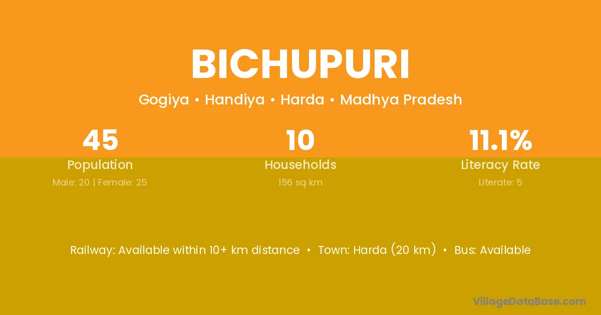 Harda (20 km) is the nearest town to Bichupuri village for major economic activities and is located approximately 20 km away.