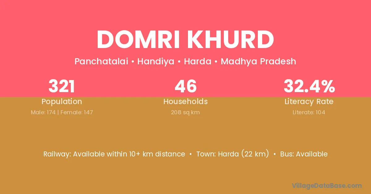 Harda (22 km) is the nearest town to Domri Khurd village for major economic activities and is located approximately 22 km away.