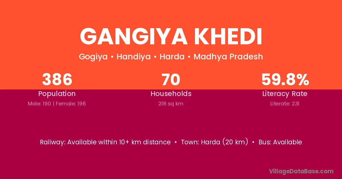 Gangiya Khedi village has a total population of 386 people, of which 190 are males and 196 are females.