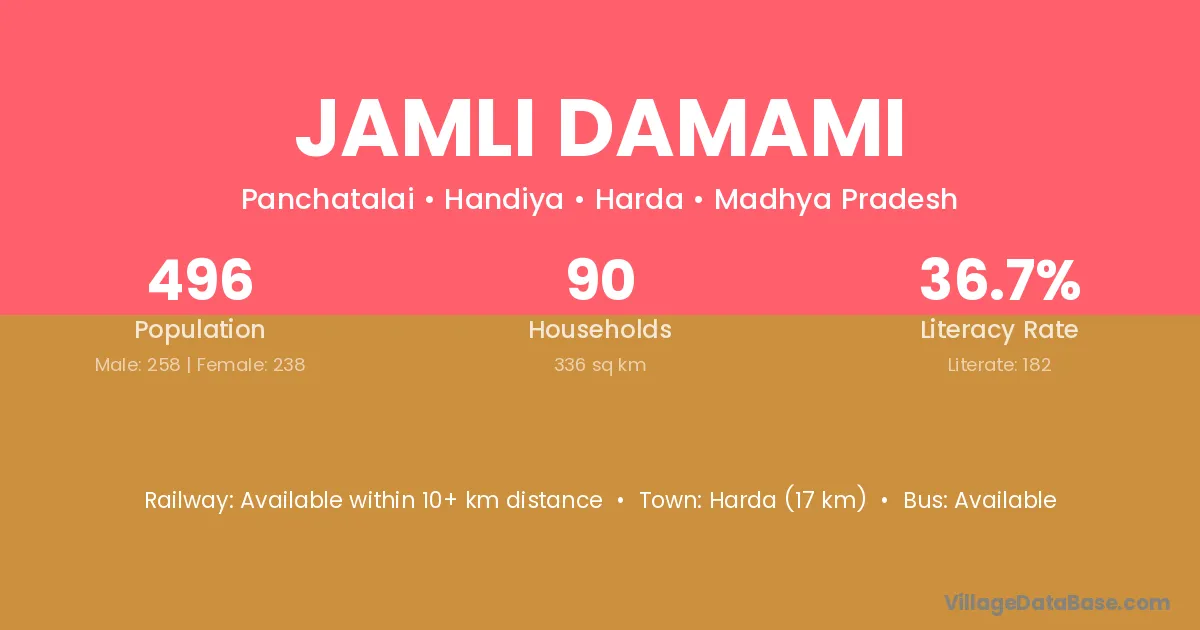 Harda (17 km) is the nearest town to Jamli Damami village for major economic activities and is located approximately 17 km away.