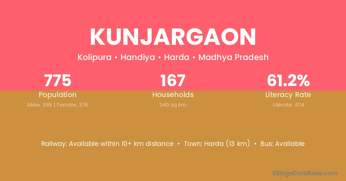 Harda (13 km) is the nearest town to Kunjargaon village for major economic activities and is located approximately 13 km away.