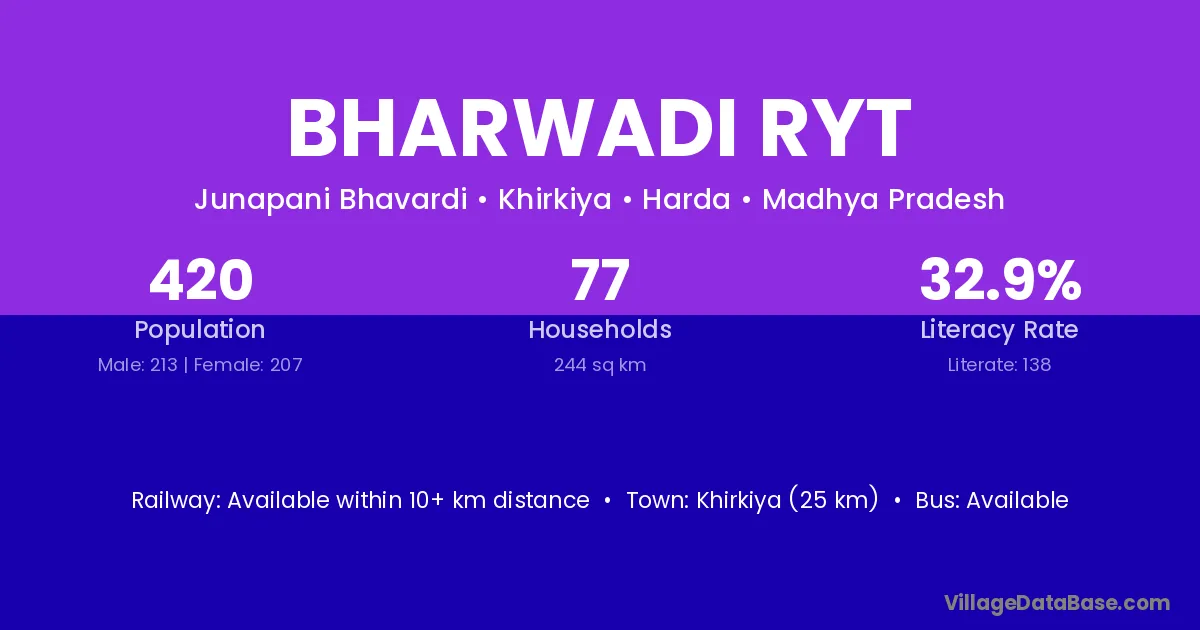 Khirkiya (25 km) is the nearest town to Bharwadi Ryt village for major economic activities and is located approximately 25 km away.