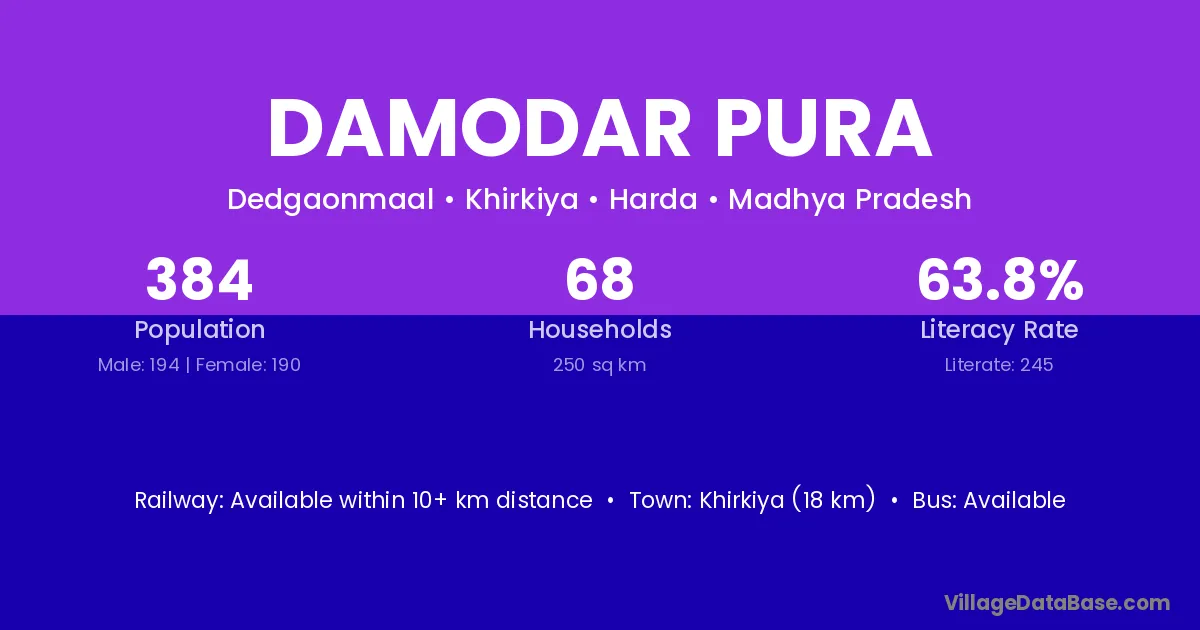 Khirkiya (18 km) is the nearest town to Damodar Pura village for major economic activities and is located approximately 18 km away.