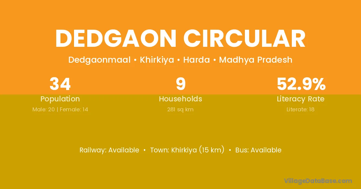 Khirkiya (15 km) is the nearest town to Dedgaon Circular village for major economic activities and is located approximately 15 km away.