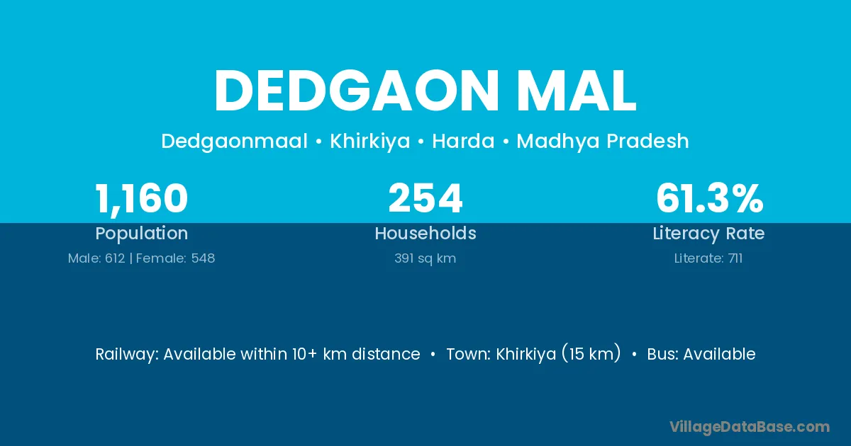 Khirkiya (15 km) is the nearest town to Dedgaon Mal village for major economic activities and is located approximately 15 km away.