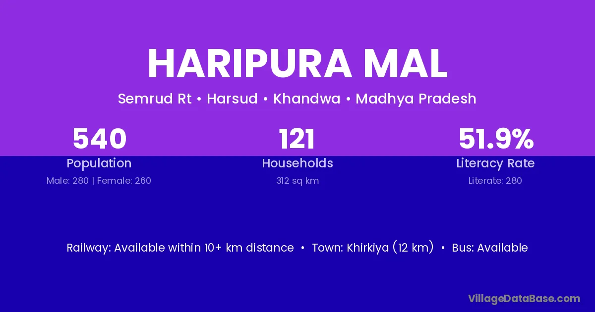Khirkiya (10 km) is the nearest town to Haripura Mal village for major economic activities and is located approximately 10 km away.