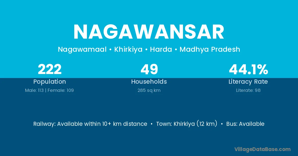 Khirkiya (12 km) is the nearest town to Nagawansar village for major economic activities and is located approximately 12 km away.