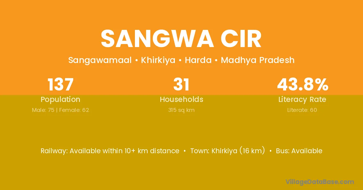 Khirkiya (16 km) is the nearest town to Sangwa Cir village for major economic activities and is located approximately 16 km away.