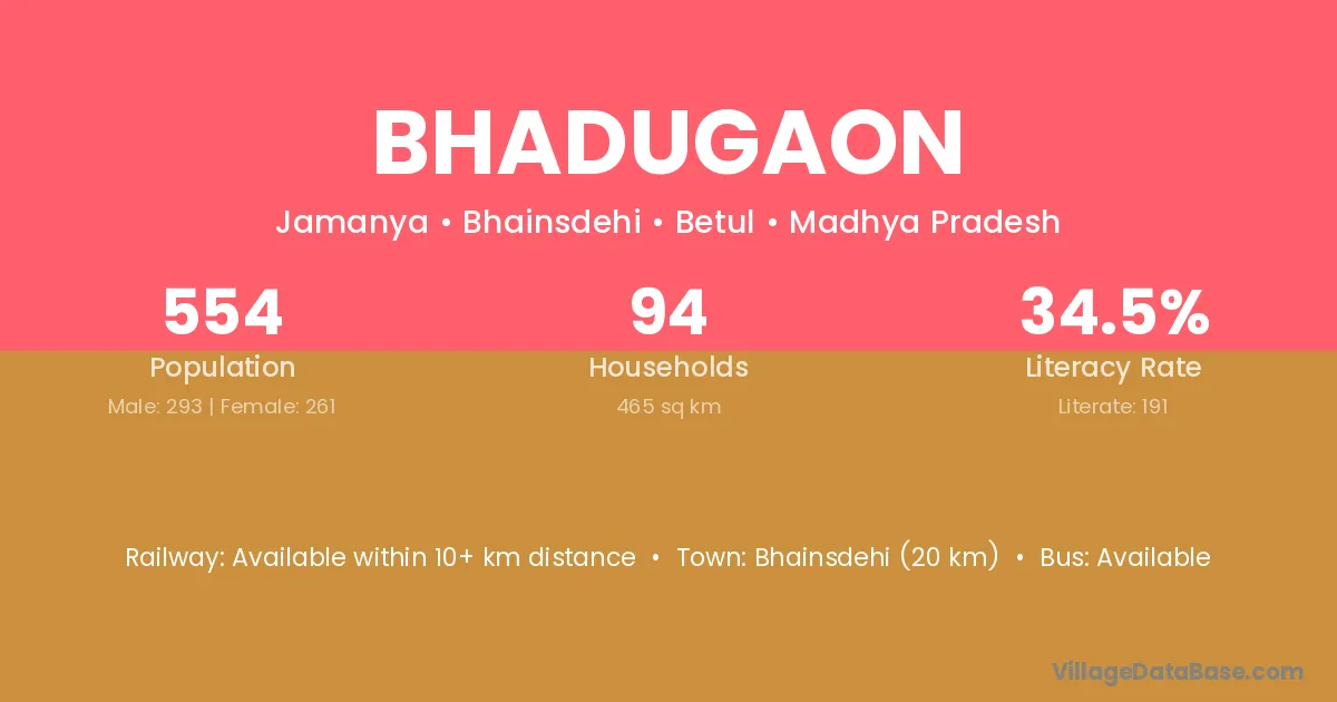 Timarni (22 km) is the nearest town to Bhadugaon village for major economic activities and is located approximately 22 km away.