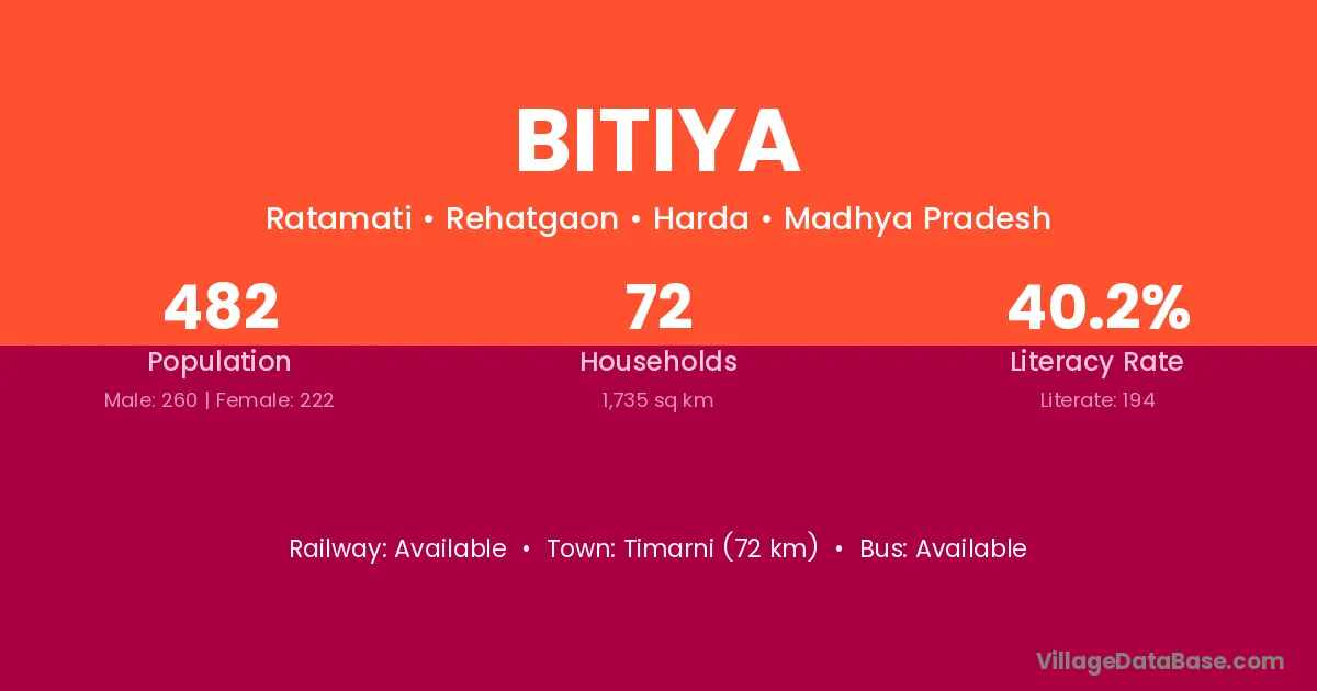 Timarni (72 km) is the nearest town to Bitiya village for major economic activities and is located approximately 72 km away.