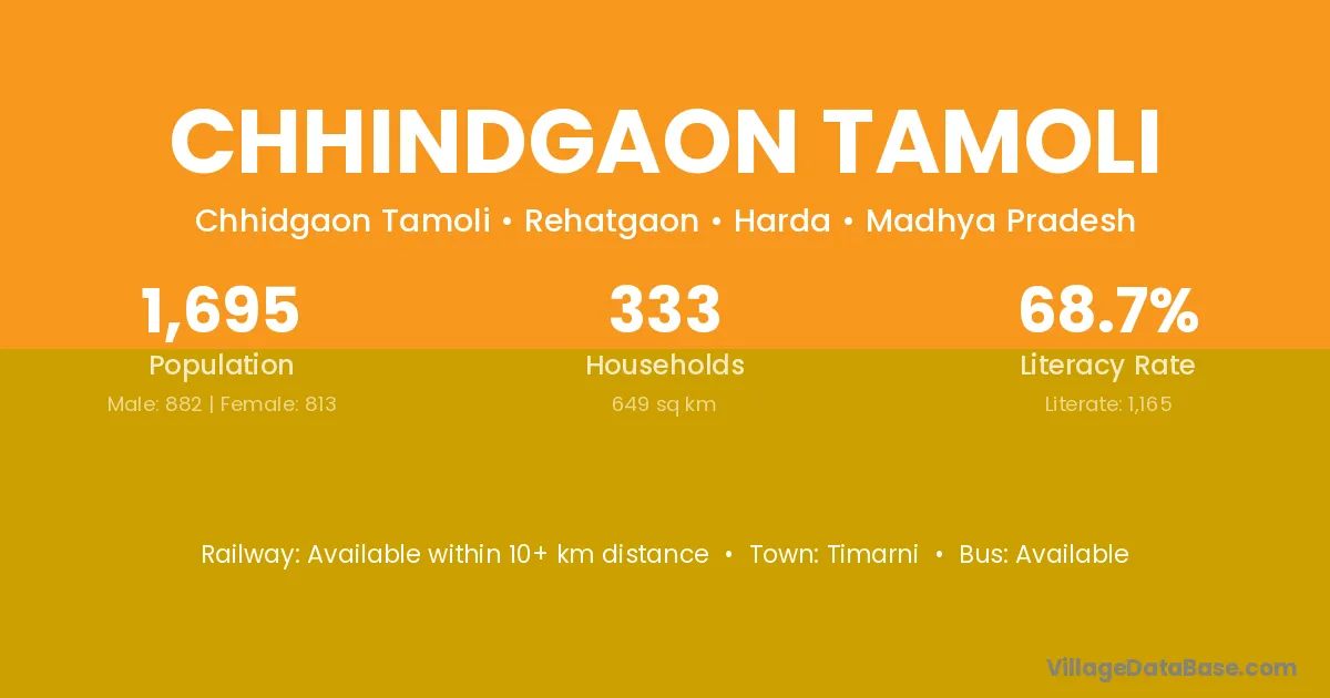 Chhindgaon Tamoli village has a total population of 1,695 people, of which 882 are males and 813 are females.