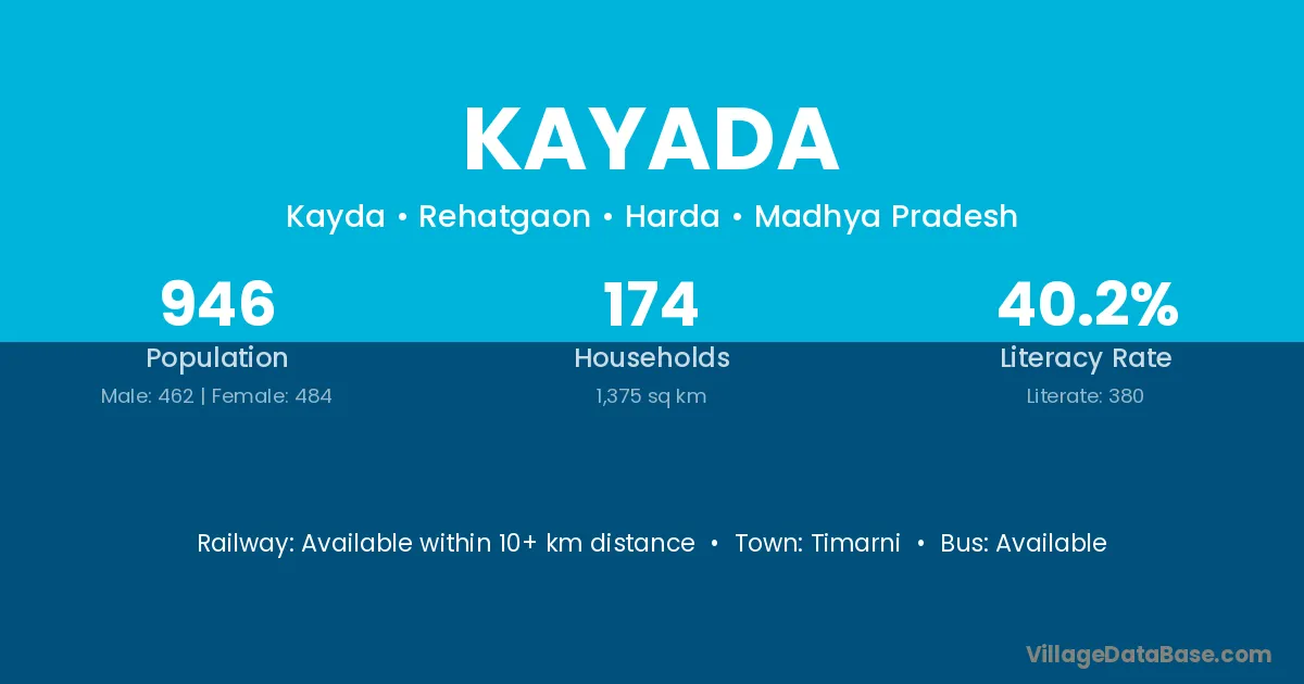 Kayada village has a total population of 946 people, of which 462 are males and 484 are females.