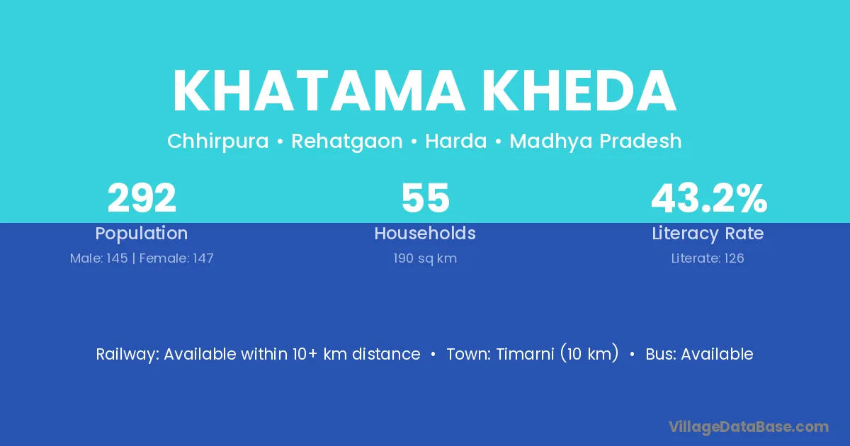 Timarni (10 km) is the nearest town to Khatama Kheda village for major economic activities and is located approximately 10 km away.