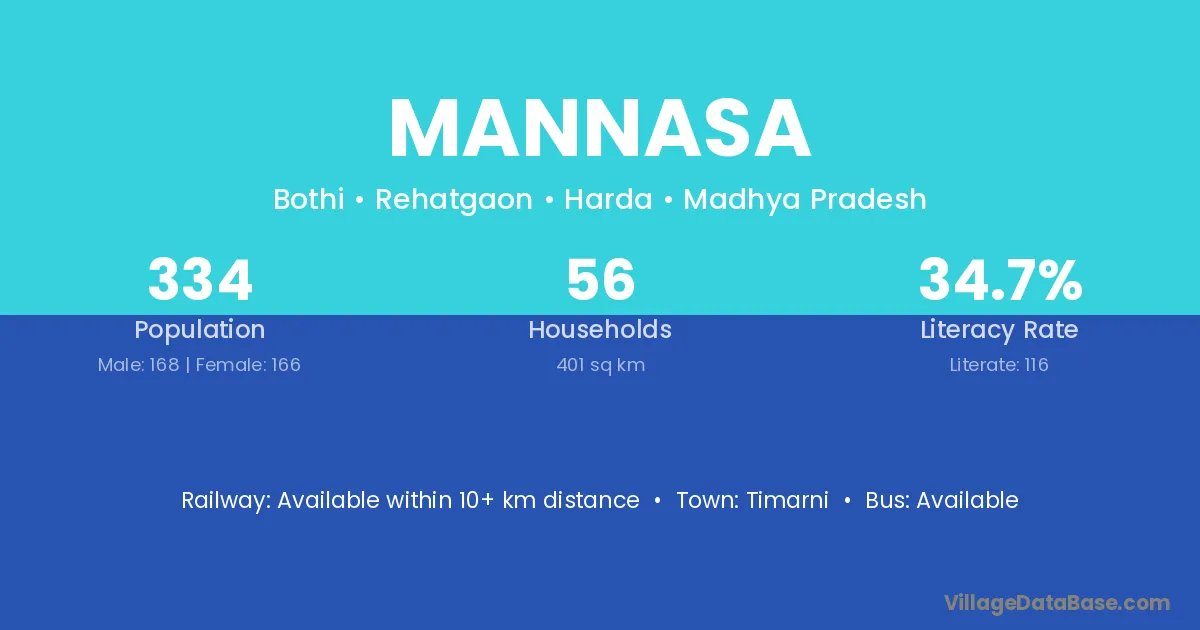 Mannasa village has a total population of 334 people, of which 168 are males and 166 are females.