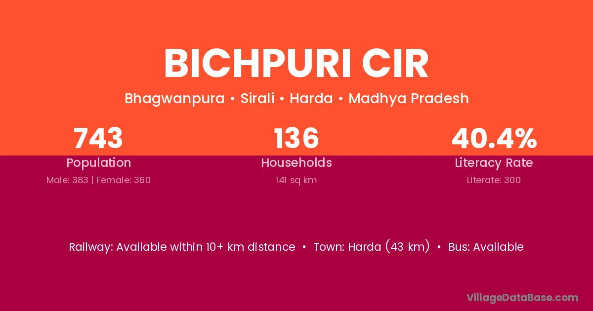 Harda (43 km) is the nearest town to Bichpuri Cir village for major economic activities and is located approximately 43 km away.