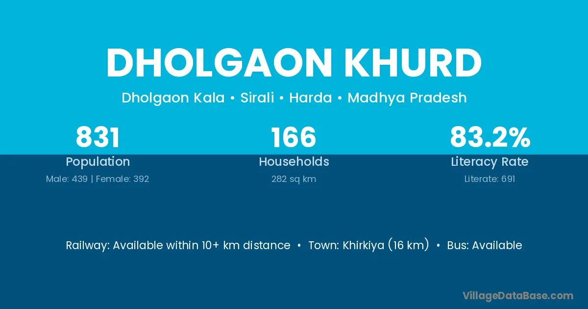 Dholgaon Khurd village has a total population of 831 people, of which 439 are males and 392 are females.