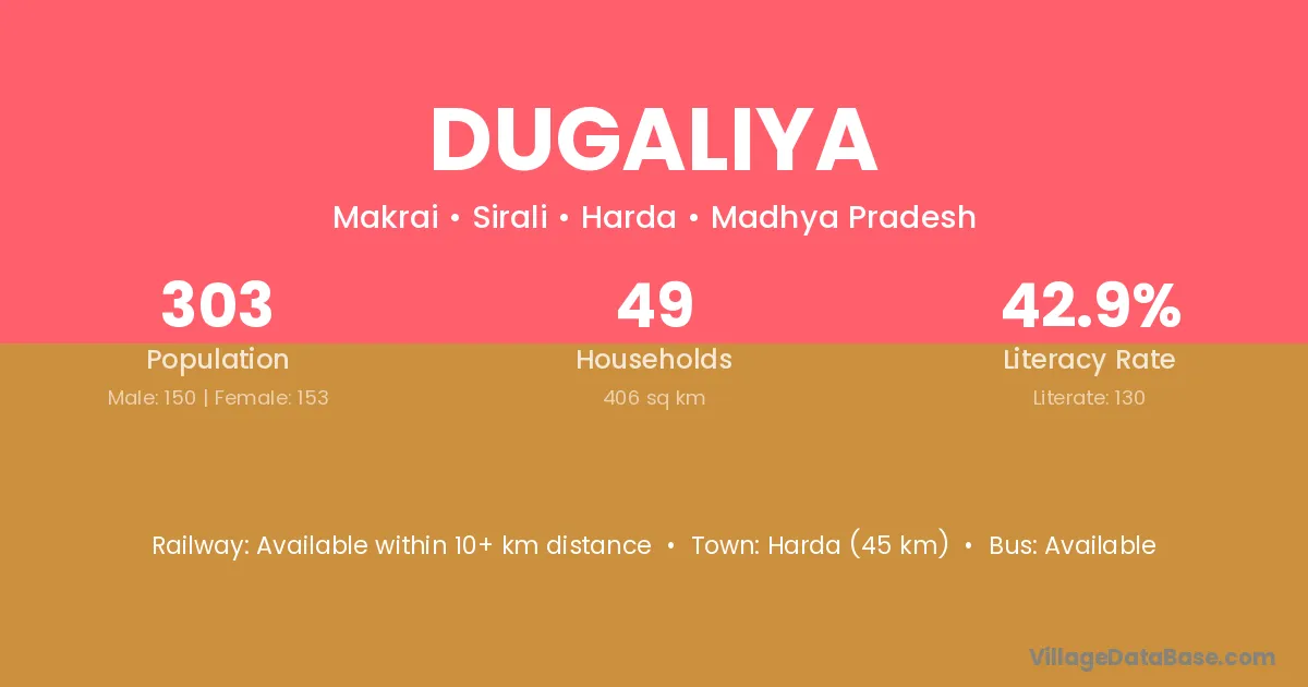 Harda (45 km) is the nearest town to Dugaliya village for major economic activities and is located approximately 45 km away.