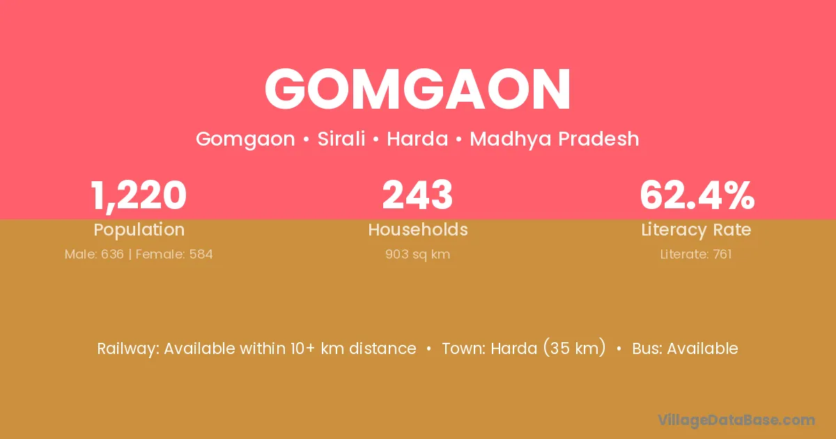 Gomgaon village has a total population of 1,220 people, of which 636 are males and 584 are females.