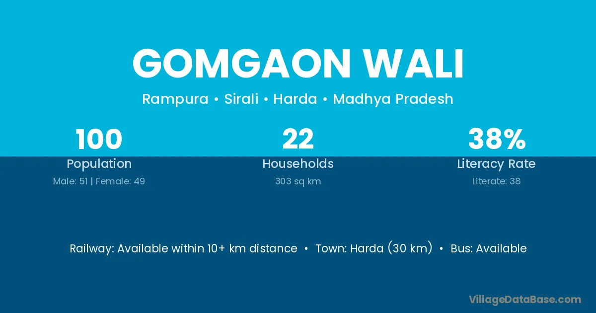 Harda (30 km) is the nearest town to Gomgaon Wali village for major economic activities and is located approximately 30 km away.