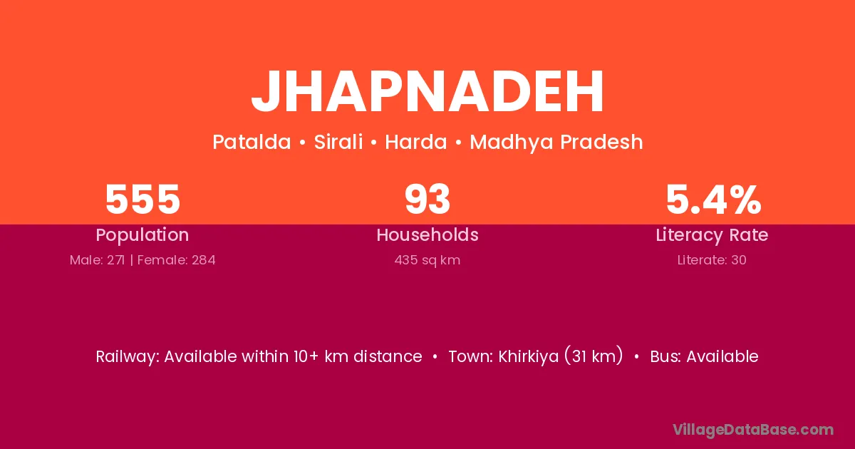 Khirkiya (31 km) is the nearest town to Jhapnadeh village for major economic activities and is located approximately 31 km away.