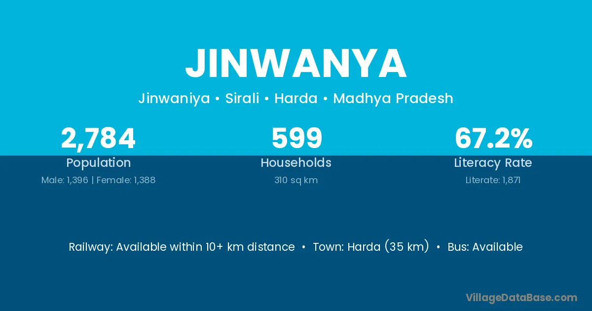 Harda (35 km) is the nearest town to Jinwanya village for major economic activities and is located approximately 35 km away.