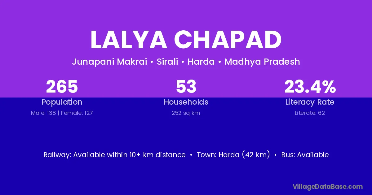 Harda (42 km) is the nearest town to Lalya Chapad village for major economic activities and is located approximately 42 km away.