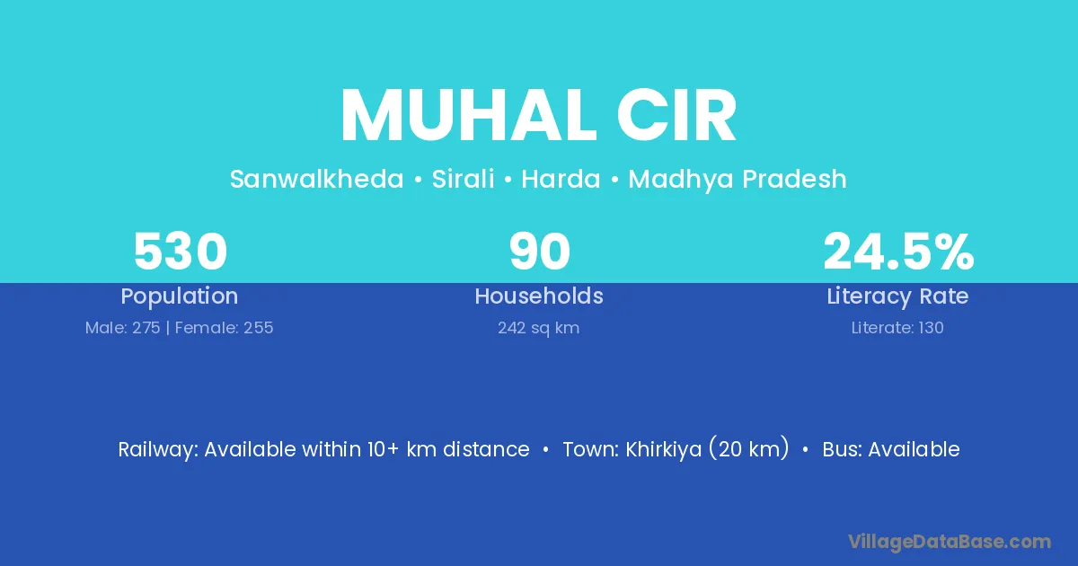 Khirkiya (20 km) is the nearest town to Muhal Cir village for major economic activities and is located approximately 20 km away.
