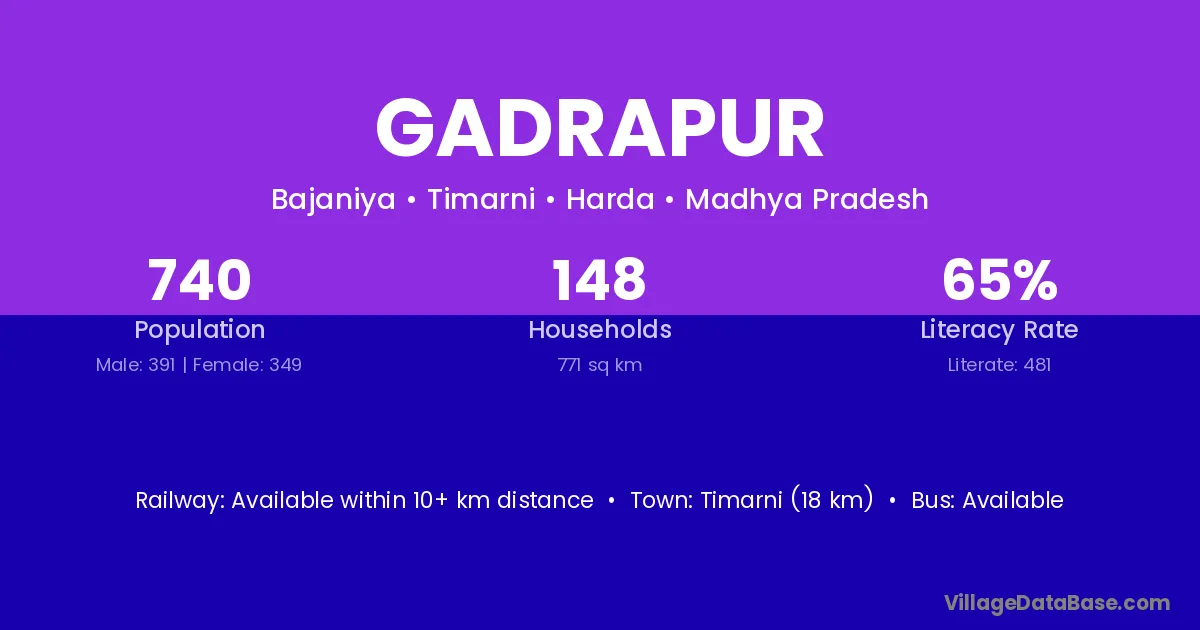 Timarni (18 km) is the nearest town to Gadrapur village for major economic activities and is located approximately 18 km away.