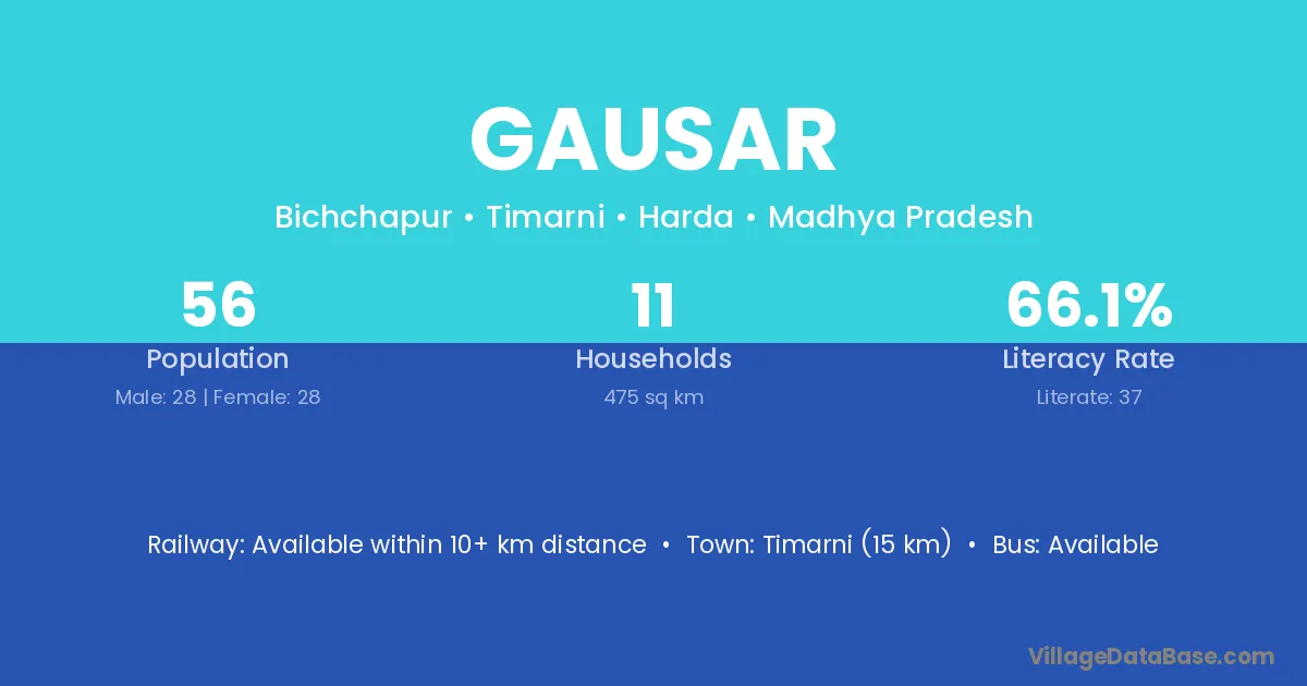 Timarni (15 km) is the nearest town to Gausar village for major economic activities and is located approximately 15 km away.