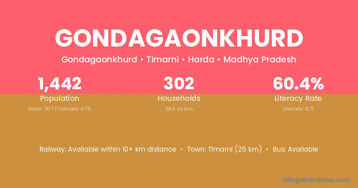 Timarni (25 km) is the nearest town to Gondagaonkhurd village for major economic activities and is located approximately 25 km away.