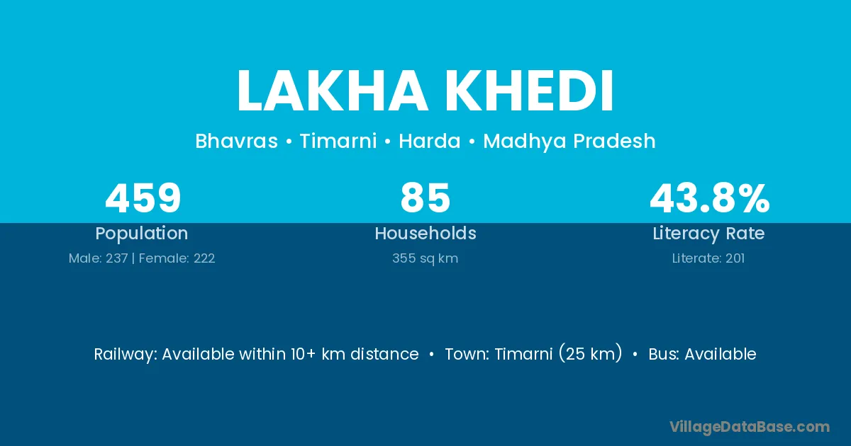 Timarni (25 km) is the nearest town to Lakha Khedi village for major economic activities and is located approximately 25 km away.