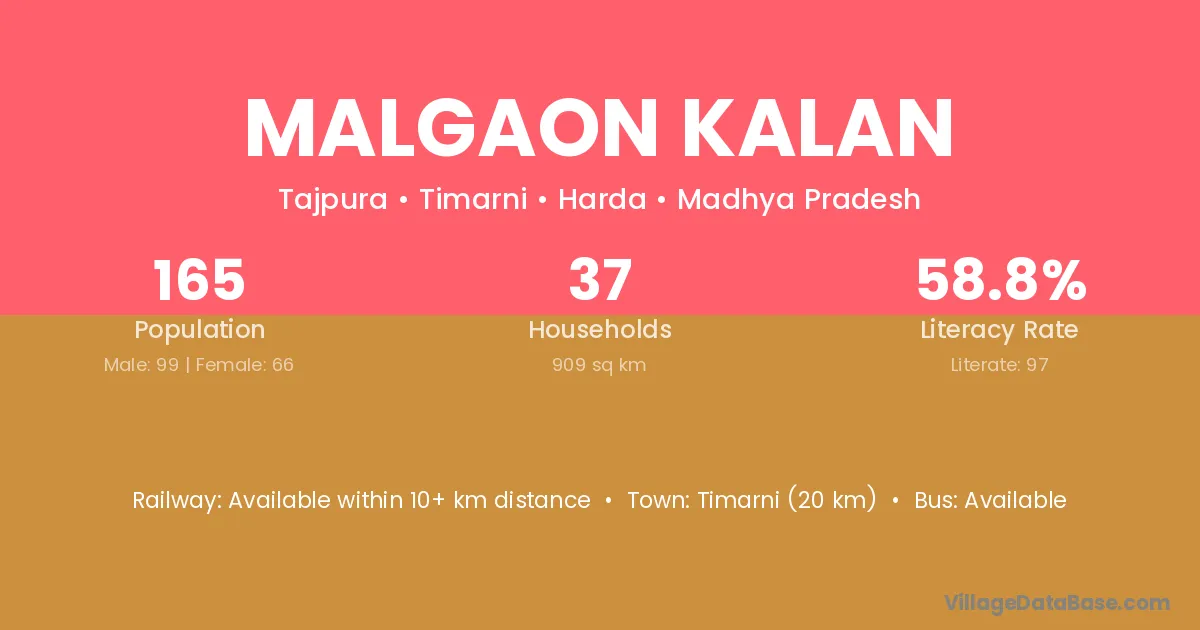 Timarni (20 km) is the nearest town to Malgaon Kalan village for major economic activities and is located approximately 20 km away.