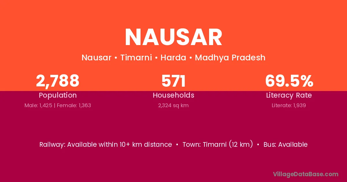 Timarni (12 km) is the nearest town to Nausar village for major economic activities and is located approximately 12 km away.