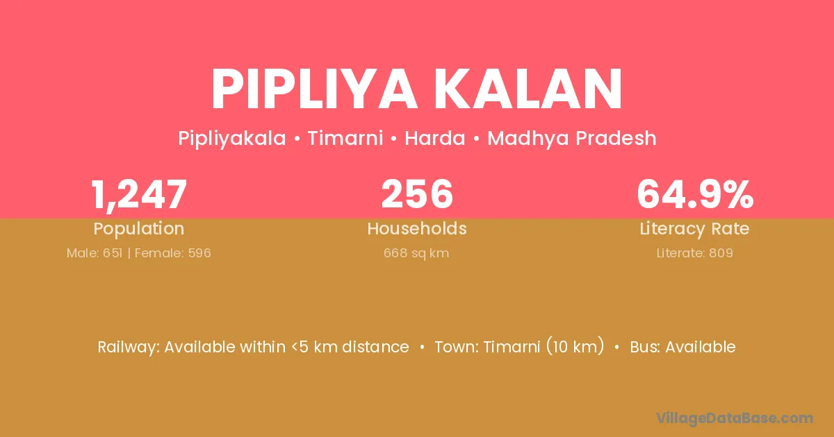 Pipliya Kalan village has a total population of 1,247 people, of which 651 are males and 596 are females.