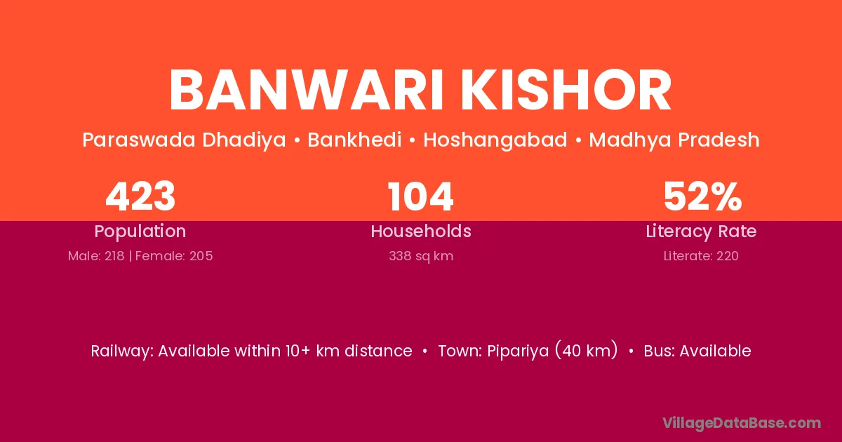 Pipariya (40 km) is the nearest town to Banwari Kishor village for major economic activities and is located approximately 40 km away.
