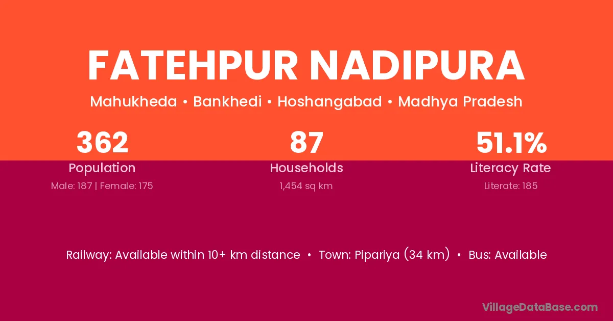 Pipariya (34 km) is the nearest town to Fatehpur Nadipura village for major economic activities and is located approximately 34 km away.